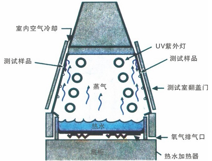 6.水槽溫度采用彩色觸摸屏程序韓國(guó)溫控儀控制加熱,水槽位于箱體下部,內(nèi)置電加熱水器。在測(cè)試過程中,有一個(gè)測(cè)試段是黑暗凝露過程,它需要箱體內(nèi)能產(chǎn)生較高溫度的飽和水蒸氣,當(dāng)水蒸氣遇到相對(duì)較冷的樣板表面時(shí),會(huì)在樣板表面凝結(jié)露水。